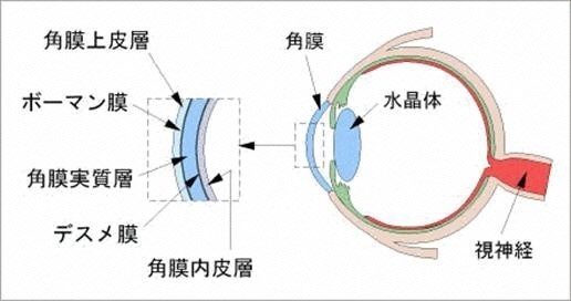 角膜はいわゆる「くろめ」と呼ばれるところを覆うもので、車のフロントガラスに例えられる眼球の一番前にある透明な組織です。角膜は、光を屈折させて眼球内に導くことと外界から細菌や化学物質の侵入を防いで内部を保護することが主な役割ですが、外の光を取り入れるためには透明であることが必要です。この透明性を保つために欠かせないのがその内側にある「角膜内皮細胞」です。