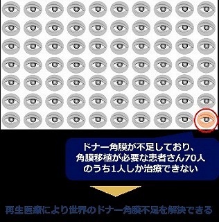 角膜移植は、世界で年間約20万人の患者さんに対して行われている移植医療ですが、ドナー角膜は圧倒的に不足しており、移植を必要としている患者70人に対して1人しか手術を受けることができないのが現状です。残りの69人は、視力の悪いまま人生を過ごすほかありません。日本でも、ドナーと移植を待つ人をつなぐアイバンクのおかげで患者さんに角膜が提供されていますが、国内ではまだまだドナー不足で、半分以上は海外からの輸入に頼っています。